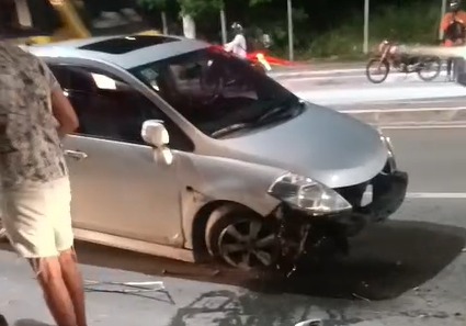 Segundo o motociclista, o carro rodou na pista, atravessou o canteiro central e só parou ao bater no meio-fio, quase provocando um segundo acidente. A frente do veículo ficou completamente destruída. Além do homem, uma criança estava dentro do veículo no momento do acidente.