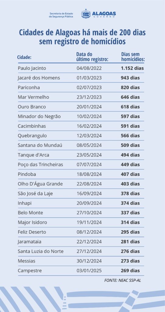 O trabalho de combate ao crime coordenado pela Secretaria da Segurança Pública de Alagoas tem surtido efeito em todo o estado, mas 22 municípios têm se destacado. Eles estão há mais de 200 dias sem registrar homicídios, o que reflete diretamente na tranquilidade e bem-estar da população.
