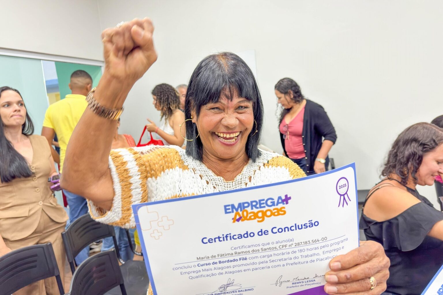 A cerimônia de entrega dos certificados foi realizada na última segunda-feira (29) e contou com a presença do secretário executivo de Gestão da Seteq, Erik Silveira, do prefeito de Piaçabuçu, Rymes Lessa, do vice-prefeito Carlos Ronalsa, da secretária municipal da Mulher, Jayane Araújo, além de outras autoridades locais.