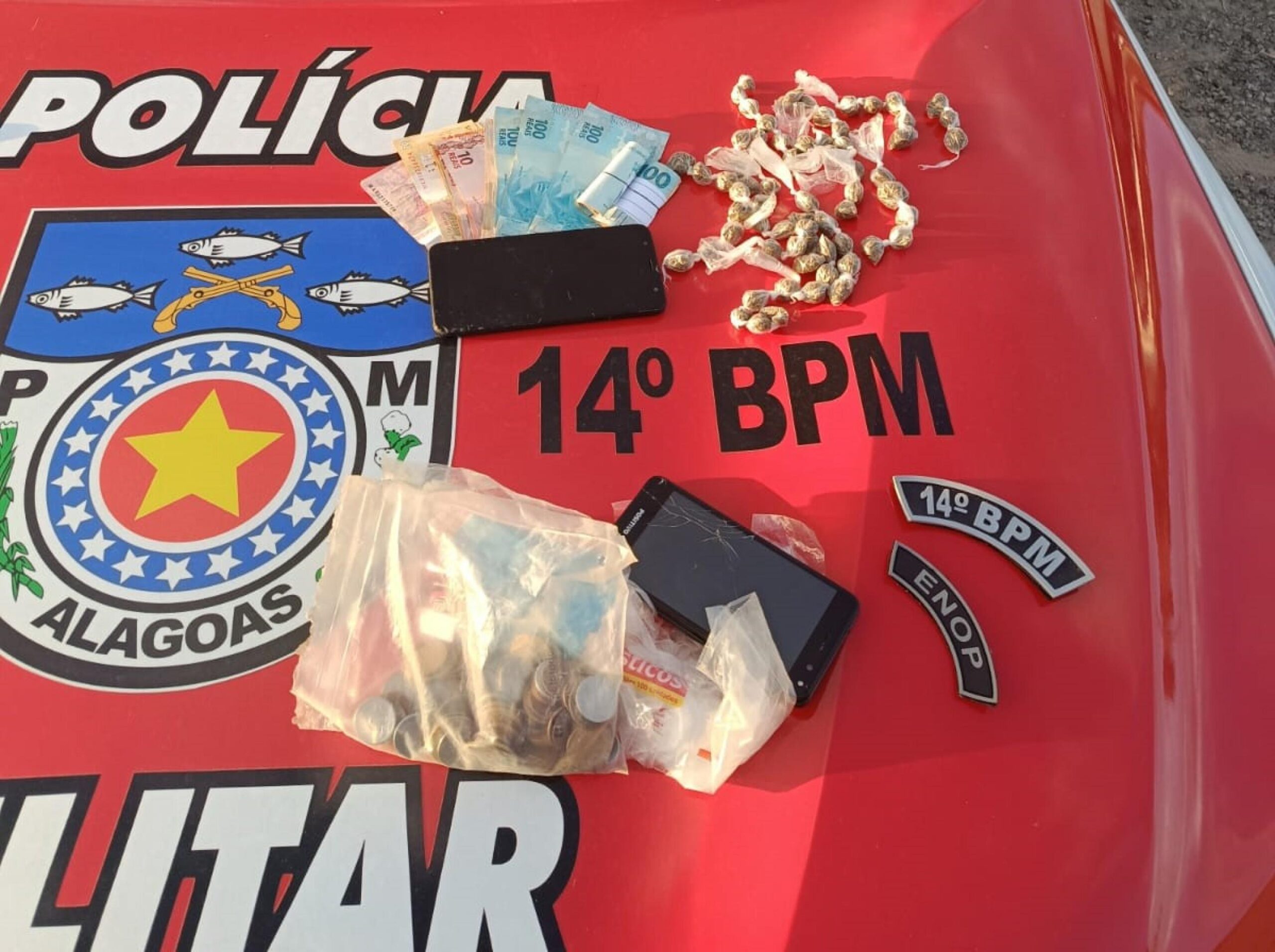 O primeiro caso, de tráfico de drogas, ocorreu na tarde de domingo (16), por volta das 16h. A PM apreendeu 66 bombinhas de maconha (45g); R$ 1.046 em dinheiro; 30 sacos plásticos para embalagem, além de aparelhos celulares e uma bolsa. O fato foi registrado em um trecho da AL-480, em um ponto de ônibus. Uma mulher de 19 anos e um homem de 26 anos foram detidos.