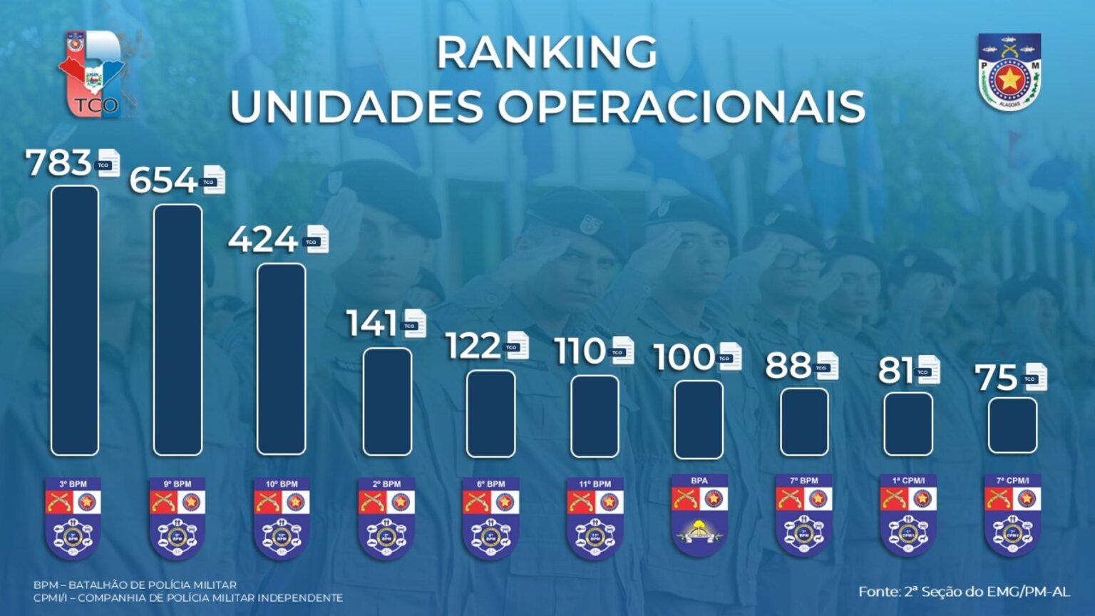 Quanto às unidades com maior volume de lavraturas entre agosto e outubro, está o 3º Batalhão de Polícia Militar (BPM). A unidade com sede em Arapiraca foi responsável por 766 TCOs, seguido do 9° BPM, com 654. Em seguida, vêm: o 10° BPM, com 424; 2° BPM, com 141; 6° BPM, com 122 e o 11° BPM, com 110. O Batalhão de Polícia Ambiental confeccionou 100 termos, seguido do 7° BPM, com 88. Em 9º e 10º colocados no ranking de TCOs estão, respectivamente, a 1ª Companhia de Polícia Militar Independente (CPM/I), com 81 e a 7ª CPM/I com 75.