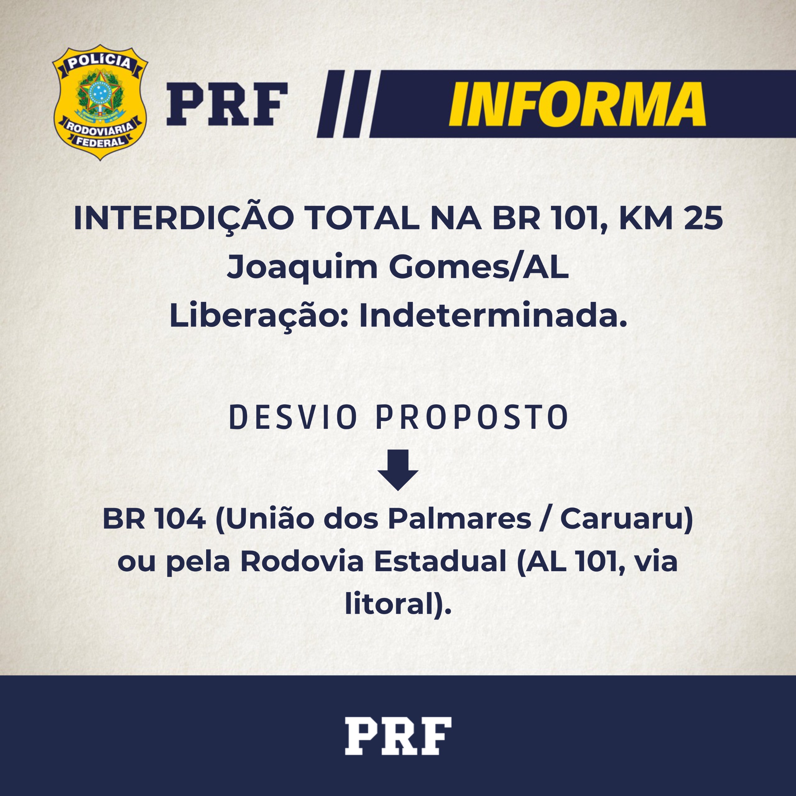 A Polícia Rodoviária Federal (PRF) informou que a BR 101, na cidade de Joaquim Gomes, foi fechada nos dois sentidos, na manhã desta quarta-feira (03). O bloqueio é um protesto dos indígenas da tribo Wassu cocal.