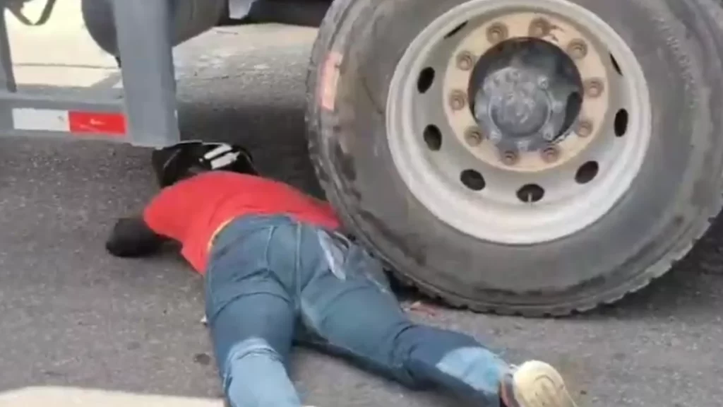 O acidente teria acontecido quando o motociclista tentou passar entre dois caminhões. Com o impacto, a motocicleta acabou ficando debaixo do caminhão.