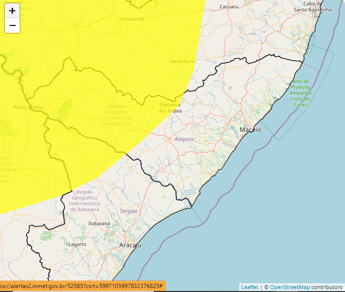 O Instituto Nacional de Meteorologia (Inmet) emitiu nesta segunda-feira (15), o alerta de baixa umidade para 35 municípios do alto e médio sertão de Alagoas. A cor amarela no alerta representa um risco de perigo potencial e ficará vigente até às 10h desta terça-feira (16).