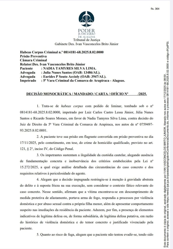 A decisão da sentença foi do desembargador Ivan Vasconcelos Brito Júnior, do Tribunal de Justiça de Alagoas (TJAL), que concedeu liminar em habeas corpus e substituiu a prisão por medidas cautelares diversas. Na decisão o desembargador ressaltou que Nadia é ré primária, possui residência fixa, exerce atividade profissional regular como médica concursada e professora universitária.
