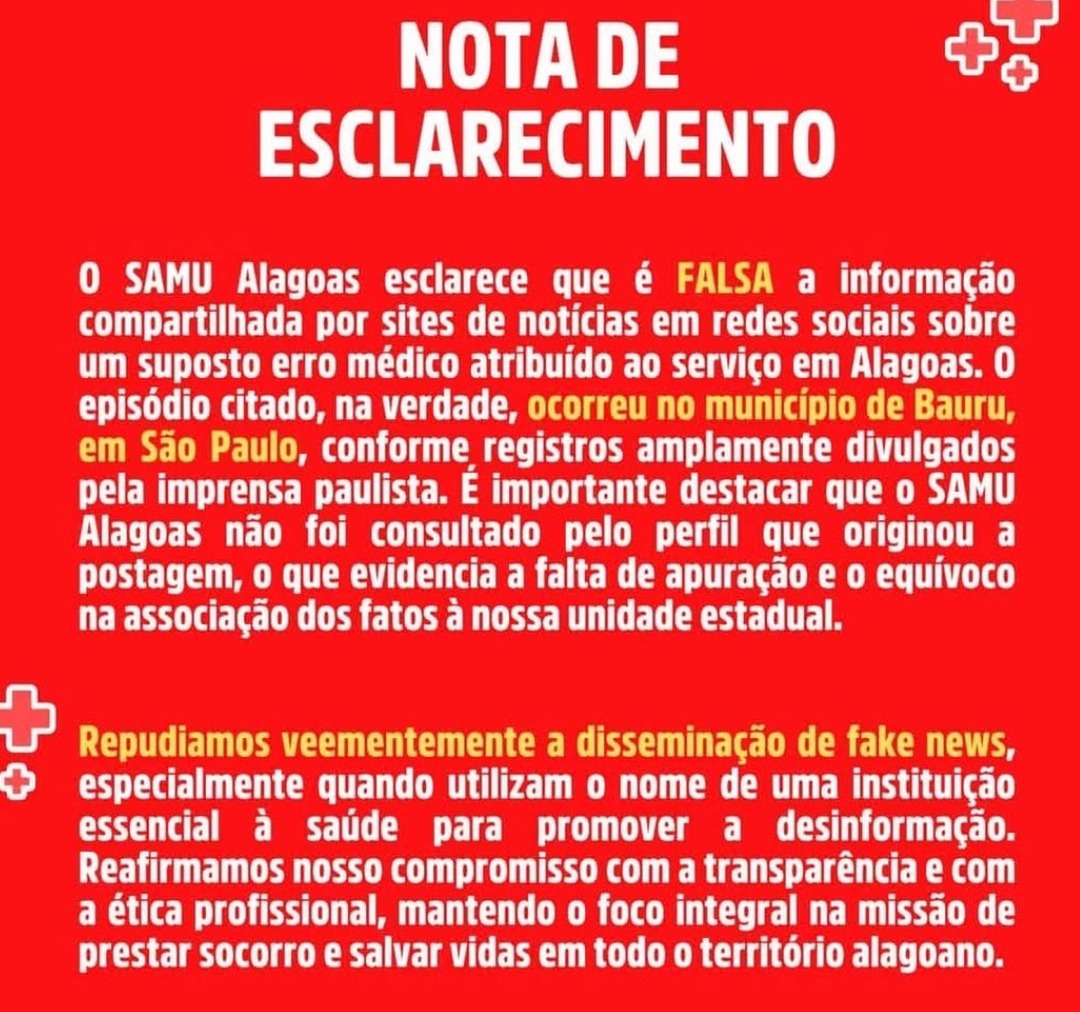 “Repudiamos veementemente a disseminação de fake news, especialmente quando utilizam o nome de uma instituição essencial à saúde para promover a desinformação”, destacou o Samu no comunicado.