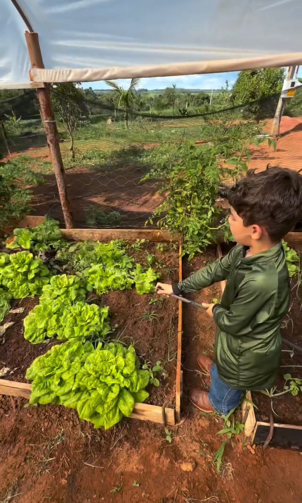 Os registros mostram Leo ajudando na rotina da fazenda, empurrando um carrinho de mão com terra e pedras, regando alfaces na horta e manuseando uma enxada ao lado do pai. A interação com os animais também chama atenção: o garoto aparece montado em um cavalo branco e, em outro momento, lavando um boi da raça Nelore no curral.