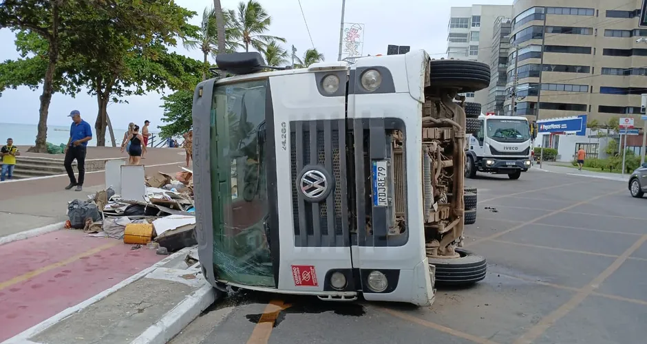 Câmeras de videomonitoramento registraram o tombamento de um caminhão de lixo em um trecho da Avenida Professor Sandoval Arroxelas, no bairro Ponta Verde, em Maceió, nesta quarta-feira (28).
