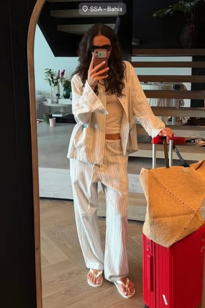 No aeroporto, a atriz compartilhou no Instagram uma selfie em que mostrou o visual escolhido para a viagem, uma roupa confortável, mas um detalhe chamou atenção dos fãs: uma bolsa de palha da grife espanhola Loewe, cujo modelo é vendido online por mais de R$ 18,3 mil.