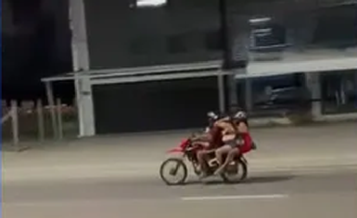 Nas imagens, uma das mulheres aparece sem apoio adequado, enquanto a criança, ainda muito nova, está posicionada entre os adultos, praticamente sem proteção. O caso reforça a preocupação com o desrespeito às normas de trânsito e ao limite de ocupação em motocicletas, fator que aumenta o risco de quedas e ferimentos graves.