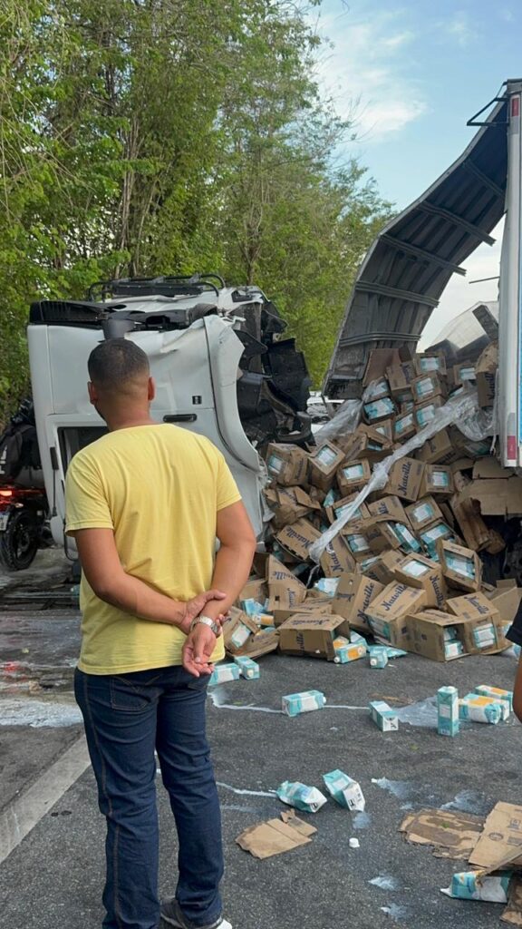 Segundo a Polícia Rodoviária Federal, a colisão ocorreu na altura do quilômetro 47 da rodovia e envolveu um carro de passeio e um caminhão carregado de leite. Com o impacto, a pista ficou totalmente interditada nos dois sentidos.
